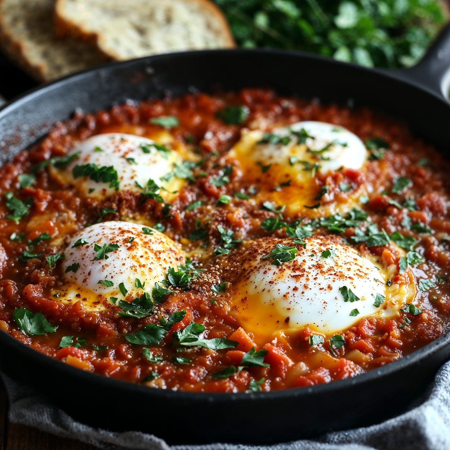 The first thing you notice is the aroma: onion, garlic, tomato, and warm spices filling the kitchen. Then comes the color: a bubbling red sauce with golden yolks tucked into the surface. And finally, that first bite, scooped up with warm bread, rich and comforting and just spicy enough to keep you going back for more.