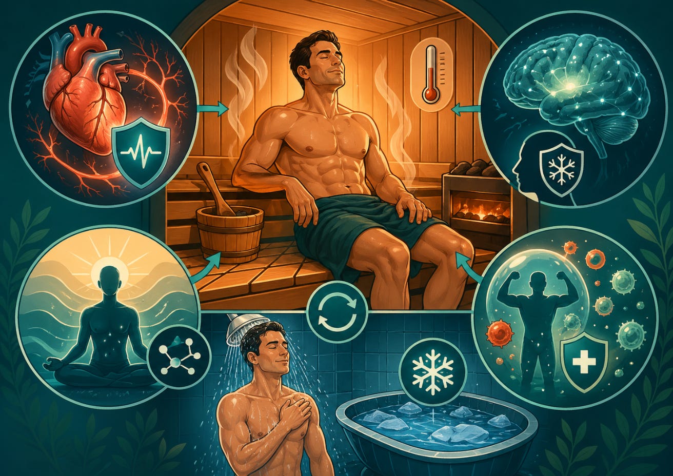 The intervention is Regular Thermal Therapy, specifically the Finnish-style dry sauna. When you sit in a sauna (ideally at 174°F / 80°C), your heart rate can climb to 120–150 beats per minute. To your heart and blood vessels, this is virtually indistinguishable from a brisk jog or a moderate cycling session.