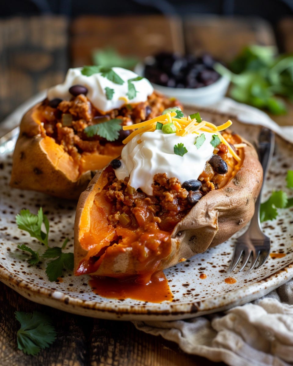 You get the natural sweetness of roasted sweet potato, a savory taco-style turkey filling, creamy cool toppings, and enough fiber and protein to make this a meal that actually keeps you full.